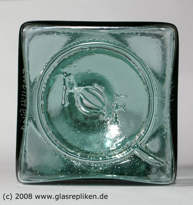 Bodenrelief einer Viereckflasche mit den zirkulär Buchstaben "PF", umschlossen von einem großen "Q"