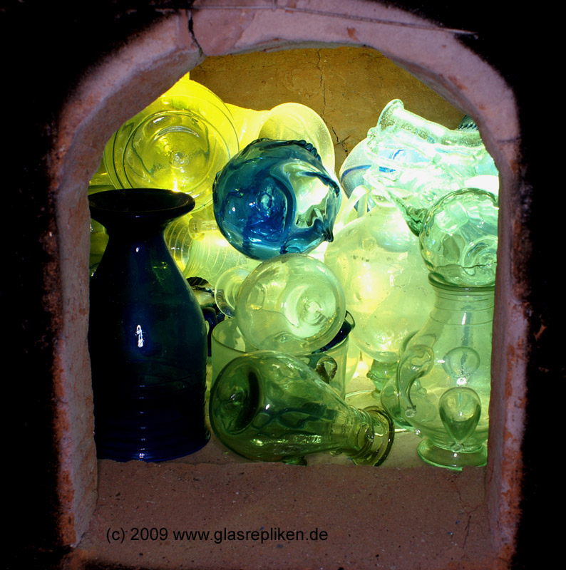Glasgefäße der Produktion vom 13.9.2009 am römischen Glasofen des PAM Velzeke. Rechts steht ein Rüsselbecher.