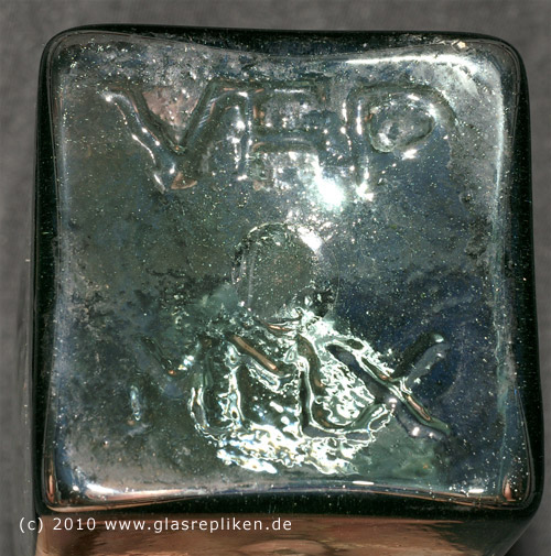 Herstellung einer formgeblasenen Vierkantflasche: Ansicht des Bodens der "Jahresflasche ´10" - VFP MMX für Velzeke Furnace Project 2010