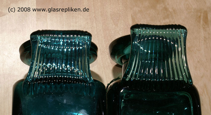 Vergleich zweier Vierkantflaschen aus der Ichendorfer Glashütte; Ansicht der Henkel Datierung der Vorlage: 1. Jh.n.Chr Fertigung der Repliken: 1969 (links), 1968 (rechts)