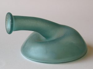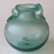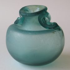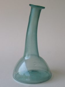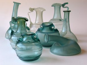 Das nächste Problem waren Eisenpartikel von der Glasbläser-Pfeife, die das Glas verunreinigten. Sie sind als kleine schwarze Flecken und dunkelgrüne Streifen erkennbar, insbesondere an Rand und Hals einiger Gefäße.