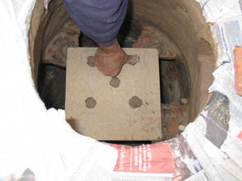 - Die Konstruktionsphase: Der kleine Arbeitsofen - die GlashäfenAls tragende Platte für die Glashäfen verwendeten wir eine 30cm x 30cm messende Ofenplatte, die auf den aus den Seitenwänden herausragenden vier Ziegelfragmenten ruhte. Unter jede Ecke befand sich zum planen Ausrichten der Platte ein Lehmklumpen. Eigentlich wollten wir ursprünglich einen dicken römischen Terracotta-Ziegel ("pedalis") als tragende Platte einsetzen, aber das sollte dann doch leider nicht sein.