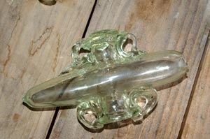 | Einen weiteren Höhepunkt des 2011er Glasofenprojekts des PAM Velzeke stellte die Herstelung diverser gläserner Faßflaschen nach römischem Vorbild dar. Beteiligt waren wieder Mark Taylor (GB), William Gudenrath (USA) und François Arnaud (F). Diese spezielle Gefäßform greift hölzerne Vorbilder auf, die auch in Keramik imitiert wurden. Für den Glasbläser bilden sie aufgrund ihrer Symmetrie und des seitlichen Ansatzes von Hals und Henkeln eine besondere Herausforderung. Exemplarisch ist hier ein Ansatz von François Arnaud (Atelier Piverre) gezeigt. |