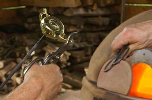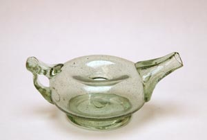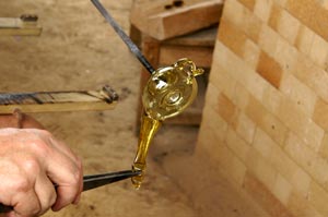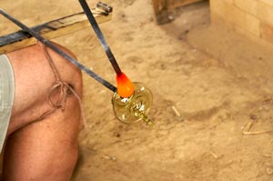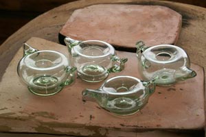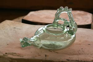 | Eine kleine Herausforderung sollte 2011 die Herstellung einiger kleiner gläserner Öllampen für die Glasbläser am römischen Glasofen des PAM Velzeke sein. Vorlagen waren zum Einen ein Foto einer Öllampe aus einer Sonderausstellung im Römermuseum Xanten, zum Anderen eine deutlich aufwendiger verzierte Öllampe aus dem Gräberfeld der Villa rustica von Rheinbach-Flerzheim. Hier bot sich die faszinierende Gelegenheit, fast simultan die unterschiedlichen Rekonstruktionsansätze von William Gudenrath (USA), Mark Taylor (GB) und François Arnaud (F) zu beobachten und vergleichen. Exemplarisch sei hier die Arbeitsweise von William Gudemrath gezeigt; die beiden einzeln vorgestellten Lampen stammen von François Arnaud. | |